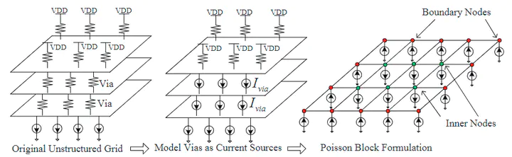 Robust and efficient algorithms for power grid analysis are crucial for both VLSI design and optimization. Due to the increasing size of power grids IR drop analysis has become more computationally challenging both in runtime and memory consumption. This work presents a fast Poisson solver preconditioned method for unstructured power grid with unideal boundary conditions. In fact, by taking the advantage of analytical formulation of power grids this analytical preconditioner can be considered as sparse approximate inverse technique. By combining this analytical preconditioner with robust conjugate gradient method, we demonstrate that this approach is totally robust for extremely large scale power grid simulations. Experimental results have shown that iterations of our proposed method will hardly increase with grid size increasing once the pads density and the range of metal resistances value distribution have been decided. We demonstrated that this approach solves an unstructured power grid with 2.56M nodes in only 1/3 iterations of classical ICCG solver, and achieves almost 20X speedups over the classical ICCG solver on runtime.