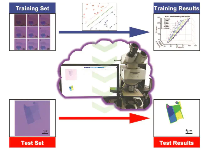 Two-dimensional (2D) materials and their heterostructures, with wafer-scale synthesis methods and fascinating properties, have attracted significant interest and triggered revolutions in corresponding device applications. However, facile methods to realize accurate, intelligent, and large-area characterizations of these 2D nanostructures are still highly desired. Herein, we report the successful application of machine-learning strategy in the optical identification of 2D nanostructures. The machine-learning optical identification (MOI) method endows optical microscopy with intelligent insight into the characteristic color information of 2D nanostructures in the optical photograph. The experimental results indicate that the MOI method enables accurate, intelligent, and large-area characterizations of graphene, molybdenum disulfide, and their heterostructures, including identifications of the thickness, existence of impurities, and even stacking order. With the convergence of artificial intelligence and nanoscience, this intelligent identification method can certainly promote fundamental research and wafer-scale device applications of 2D nanostructures.