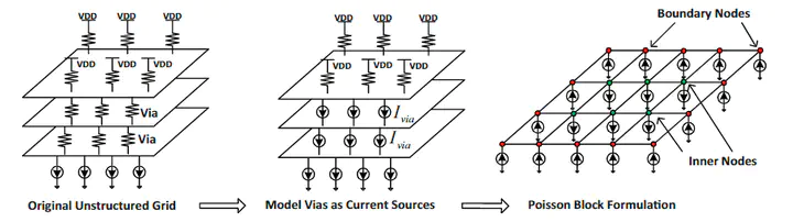 Robust and efficient algorithms for power grid analysis are crucial for both VLSI design and optimization. Due to the increasing size of power grids, IR drop analysis has become more computationally challenging both in runtime and memory consumption. This paper presents a Fast Poisson Solver (FPS) preconditioned method for unstructured power grids with unideal boundary conditions. Unstructured power grids are transformed to structured grids, which can be modeled as Poisson blocks by analytic formulation. The analytic formulation of transformed structured grids is adopted as an analytic preconditioner for original unstructured grids, in which the analytic preconditioner can be considered as a sparse approximate inverse technique. By combining this analytic preconditioner with robust conjugate gradient method, we demonstrate that this approach is totally robust for extremely large scale power grid simulations. Theoretical proof and experimental results show that iterations of our proposed method will hardly increase with the increasing of grid size as long as the pads density and the distribution range of metal conductance value have been decided. We demonstrate that the run efficiency of our approach is much higher than classical incomplete Cholesky factorization preconditioned conjugate gradient solver and random walk-based hybrid solver.